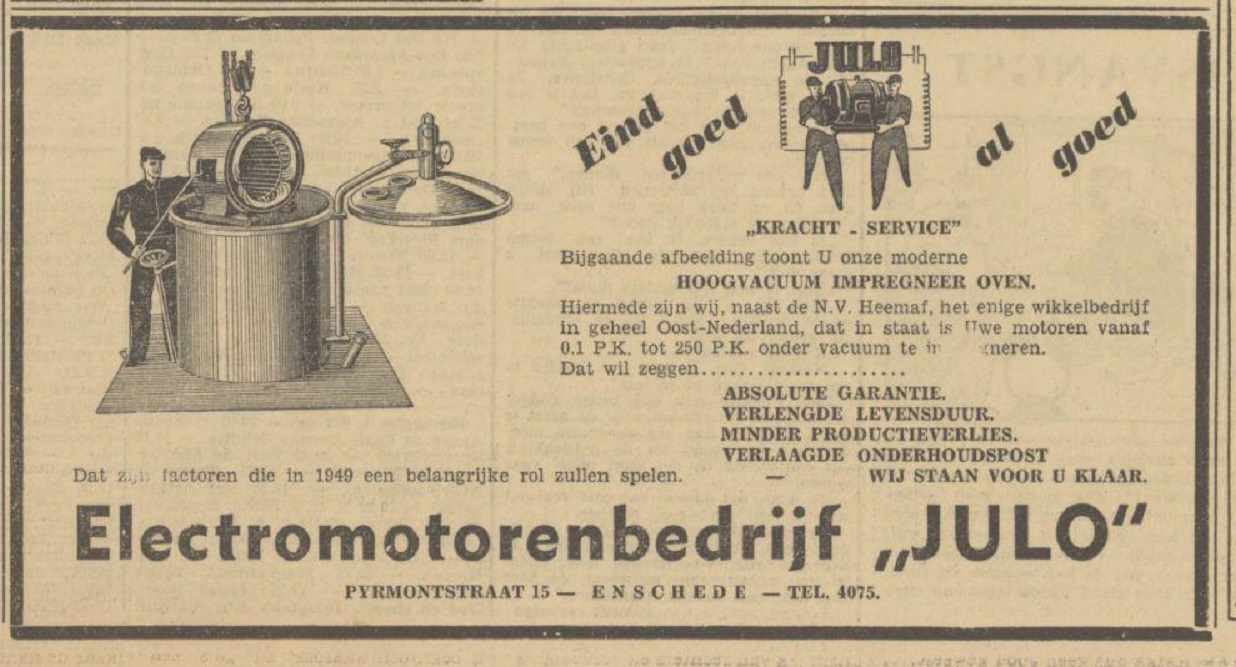 Pyrmontstraat 15 Electromotorenbedrijf Julo advertentie Tubantia 31-12-1948.