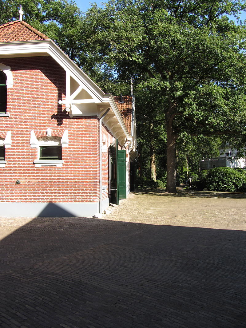 Omschrijving De DIENSTWONING annex KOETSHUIS is opgetrokken vanuit een nagenoeg vierkante plattegrond over één bouwlaag onder een deels afgewolfd schilddak met overstek. Aan de westzijde een uitbouw over twee bouwlagen eveneens onder een afgewolfd schilddak. De daken zijn gedekt met oud Hollandse pannen. De gootlijst rondom rust op korbelen. Het in rode bakstenen gemetselde pand staat op een met cement aangestreken plint. De hoofdentree in de westgevel is centraal geplaatst in een uitbouw onder lessenaarsdak. De opgeklampte deur wordt geflankeerd door twee drieruits vensters behangen met luiken. Links van de entree een uitbouw met op de begane grond een kruisvenster met negenruits bovenlichten, behangen met luiken, en op de verdieping een achtruits drielicht. Langs de dakrand windveren. Rechts van de entree een twintigruits draaivenster met luiken. Alle vensters zijn rechtgesloten onder een segmentboog. Ter plaatse van het uilebord een zesruits draaivenster. In de noordgevel twee opgeklampte deuren voor het koetshuisgedeelte. De zijgevel van de aanbouw bevat op de begane grond een zestienruits draaivenster en een kloosterkozijn met negenruits bovenlicht, beide behangen met luiken, en op de verdieping een drielicht met roedenverdeling. Muurankers op de verdiepingscheiding. Centraal in de achtergevel (O) een dubbele opgeklampte inrijdeur met toog, geflankeerd door vierruits vensters. Erboven, tegen het wolfeind een draaivenster met roedenverdeling. Op de plaats van het uilebord een twaalfruits draaivenster. In de zuidgevel rechts van het midden een risaliet onder een steekkap met twintigruits draaivenster en een bandraam in de geveltop met beschot. Links van de risaliet twee vijftienruits vensters, rechts een twaalfruits draaivenster. Alle vensters op de begane grond zijn behangen met luiken. Waardering Dienstwoning annex koetshuis van cultuur-, architectuurhistorisch en stedebouwkundig belang: - vanwege de bijzondere typologie, vormgeving en detaillering - door de functioneel ruimtelijke samenhang met de andere complexonderdelen - vanwege de uitwendige gaafheid - vanwege de nog herkenbare samenhang met de tuinaanleg (bron: Rijksdienst voor het Cultureel Erfgoed).