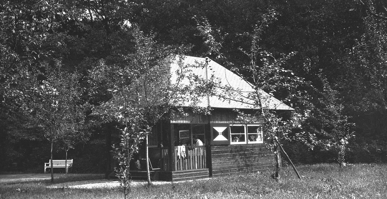 Omschrijving SPEELHUISJE (rond 1920) met wanden van bruin geschilderde rabbatdelen en een veranda onder sterk overstekend met dakleer gedekt schilddak. In de voorgevel een dubbele glasdeur tussen vensters met horizontale roedenverdeling. De veranda heeft een eenvoudig houten lattenhek. De vensters met horizontale roedenverdeling in de zijgevels zijn behangen met luiken waarop een witte zandloper is geschilderd. Waardering Houten speelhuisje van belang vanwege: