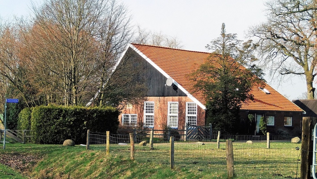 Boerderij "Het Tijberend" met houten geveltoppen, een plint van Bentheimer zandsteen, vensters met kalf en roedenverdeling. De boerderij heeft boogvormige deeldeuren in de achtergevel.