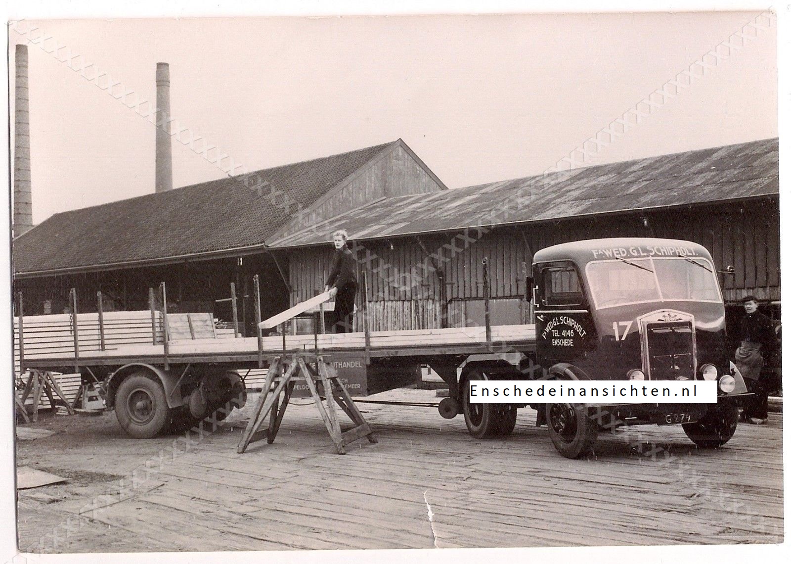 Het is in ieder geval voor 1951, want de vrachtauto heeft nog een provinciaal kenteken. Als ik een gooi moet doen: Beltman Hout & Plaat, ergens aan de Eeftinkstraat dacht ik. Kan ook de Gasfabriekstraat geweest zijn. Ik zit alleen met die twee pijpen. Gasfabriek had er maar één volgens mij.