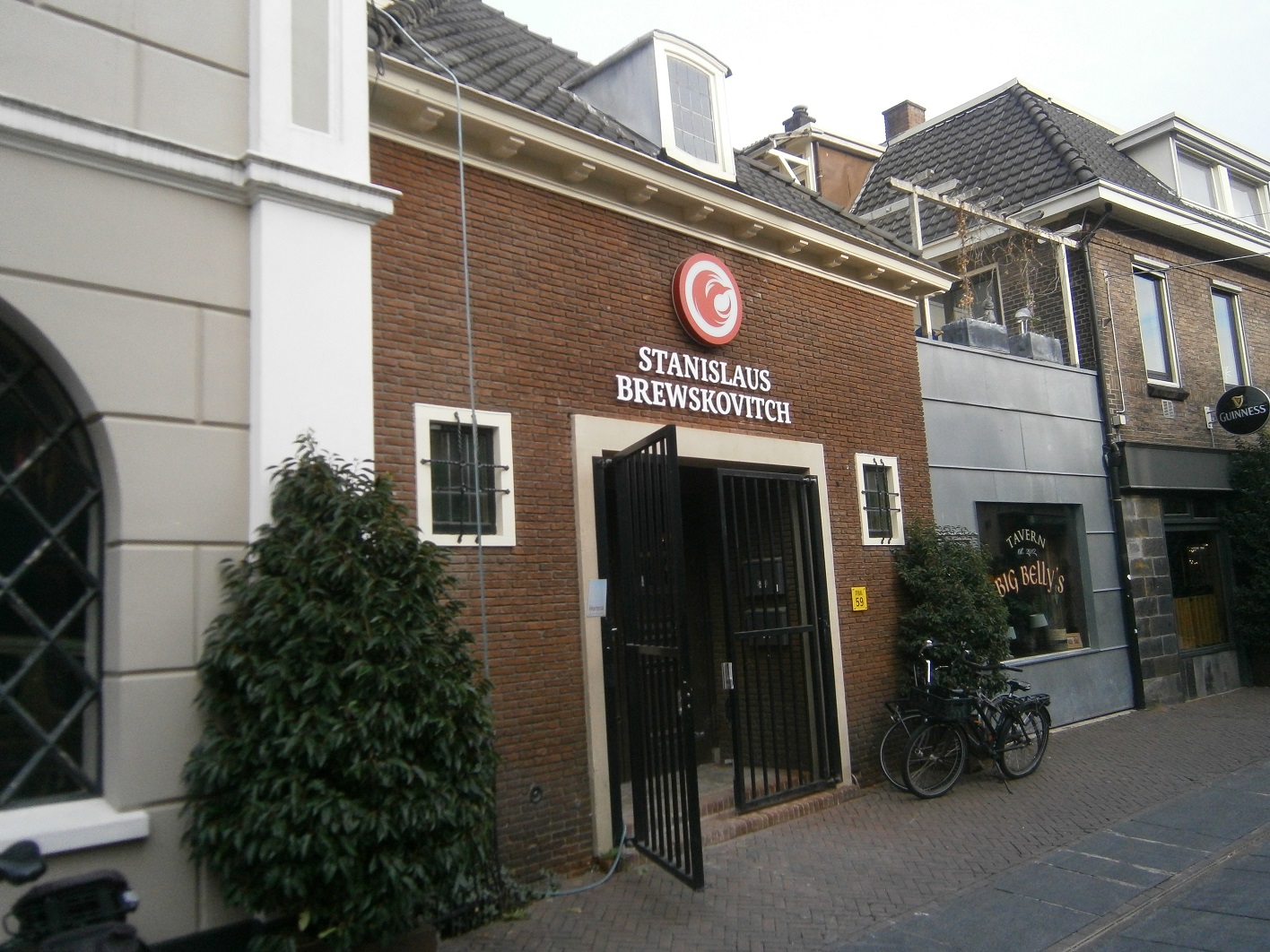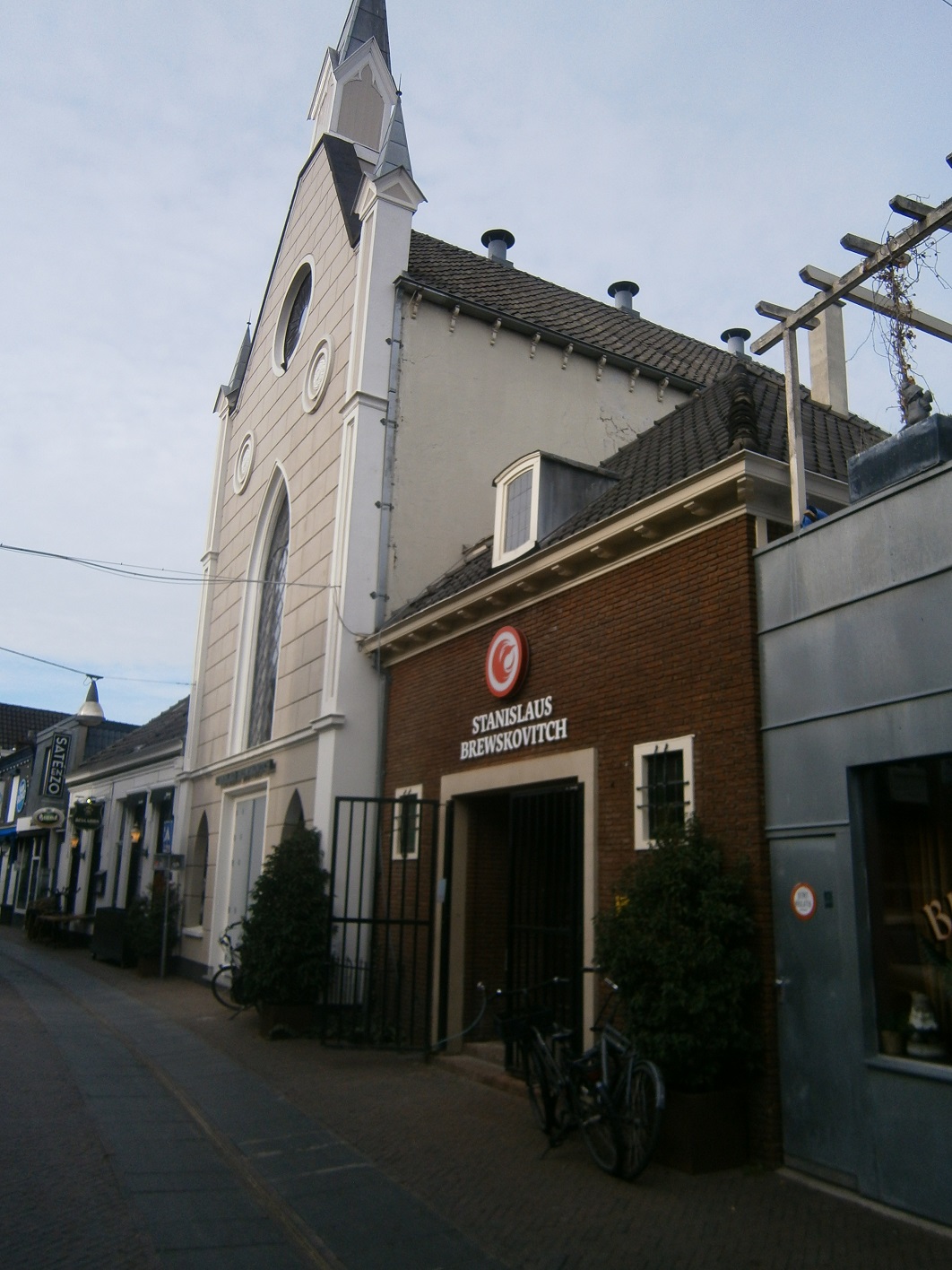 Delftse School, gebouwd tussen 1945 en 1955. Maar daar is veel, heel veel van in Enschede. Zo'n beetje alle wederopbouwpanden die na de oorlog zijn herbouwd is Delftse School. Laat dit nou geen wederopbouwpand zijn! Maar in die tijd vond men het nodig om een andere ingang te maken voor de Doopsgezinde kerk aan de Stadsgravenstraat. En dat issem Arie. Bij de pas geopende stadsbrouwerij heeft men de oorspronkelijke ingang weer in ere hersteld.
