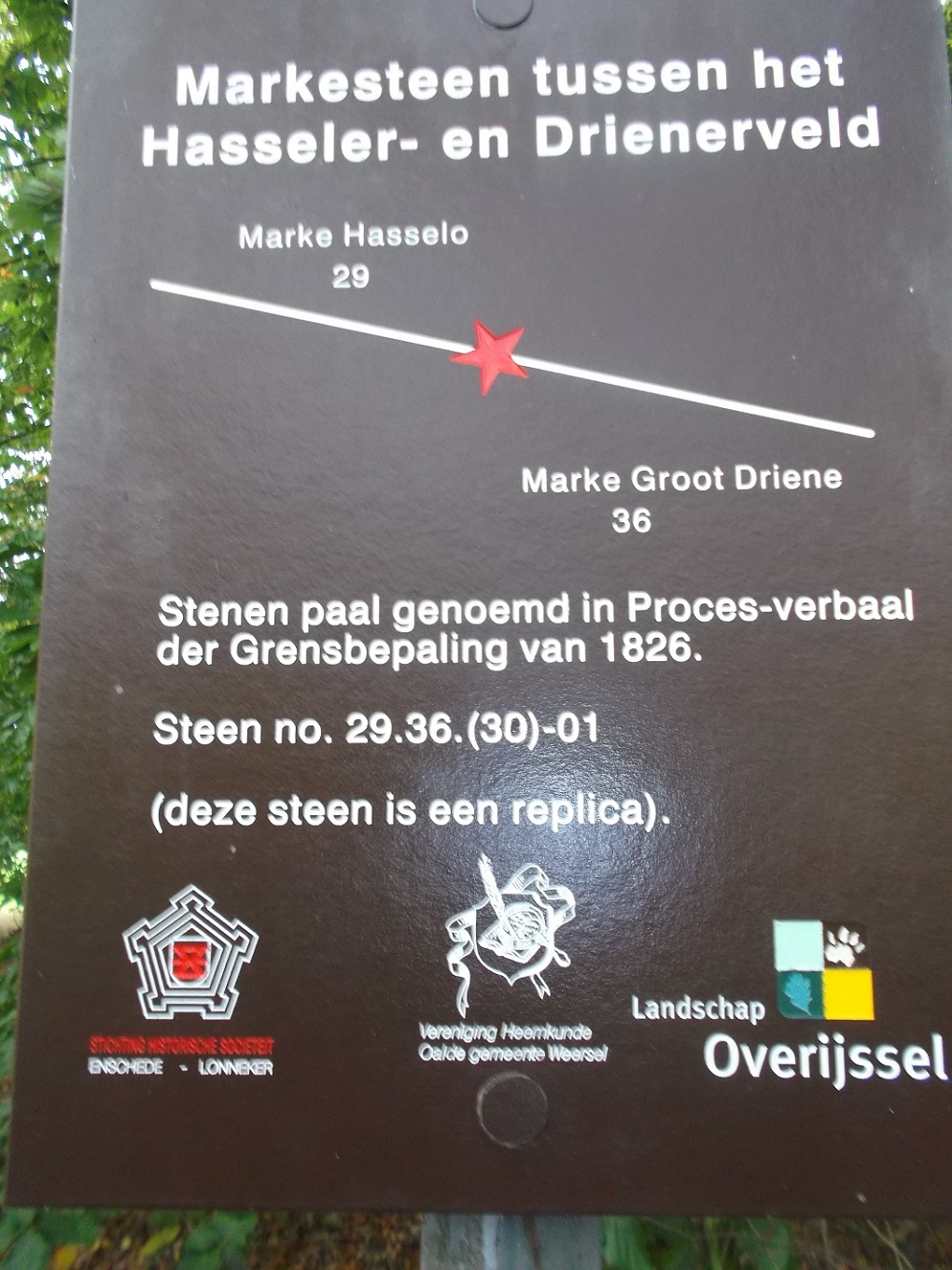De volledige naam luidt: stenen paal tussen het Hasseler- en Drienerveld. Markesteen Groot Driene-Hasselo. Hasselo is een van de marken van de oude gemeente Weerselo, nu gemeente Dinkelland. Aan het eind van dit pad staat een vogelkijkhut die uitzicht geeft over het Lonnekermeer.