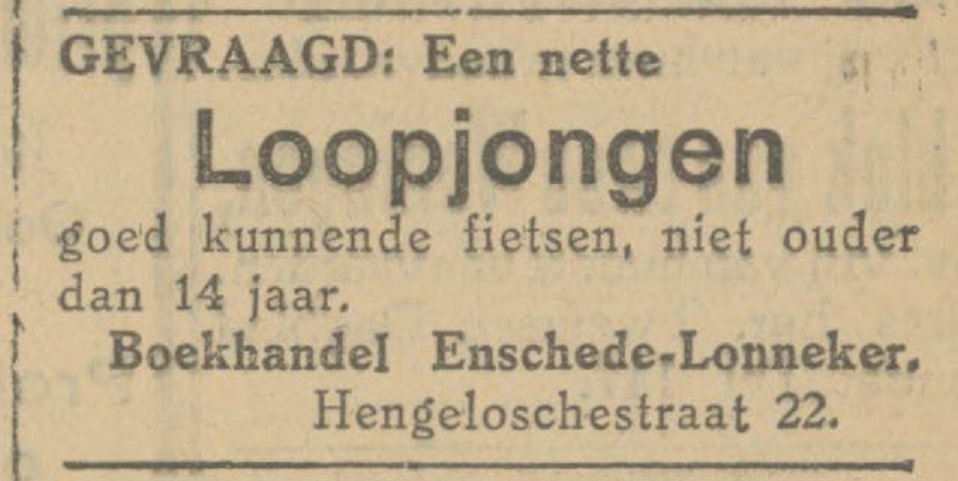 Wel merkwaardig deze advertentie Hengeloschestraat 22 van Boekhandel Enschede-Lonneker uit de Tubantia va 23-8-1927. Hierin wordt een loopjongen gevraagd die wel goed moet kunnen fietsen en niet ouder zijn dan 14 jaar. Was er in 1927 nog kinderarbeid?