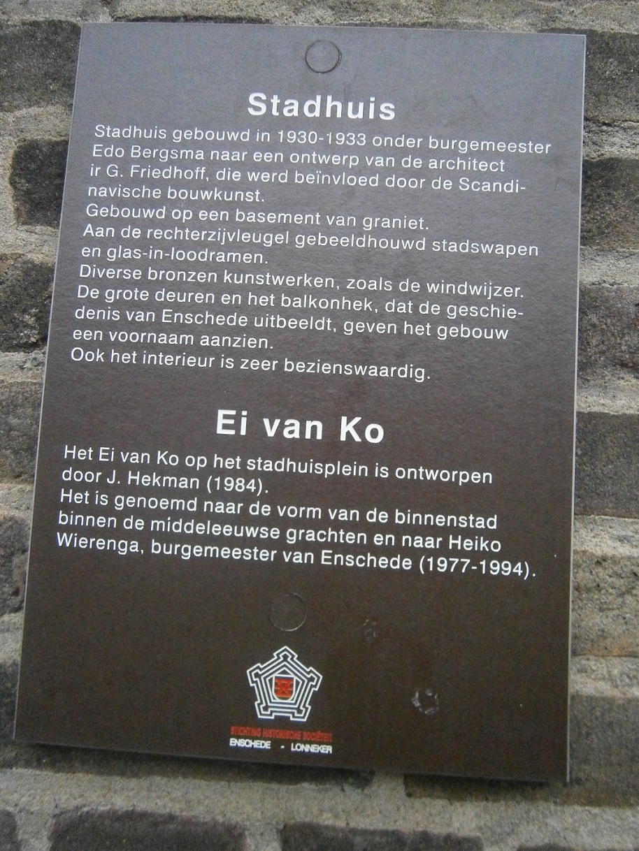 Van het Ei van Ko was er eerst een apart monumentenbordje maar mocht niet worden geplaatst op het kunstwerk. Zie hierover het volgend bericht in de Tubantia van 8-2-2013: