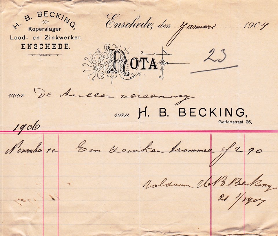 Getfertstraat 26 Koperslager H.B. Becking nota 1907.