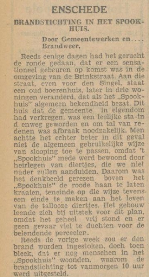 Over het inbrandsteken van het Spookhuis aan de Brinkstraat zie onderstaand krantenbericht uit de Tubantia van 29-6-1931.enschedeinansichten schreef: ↑zo dec 09, 2018 1:47 pm Is daar iets over bekend, raar verhaal.