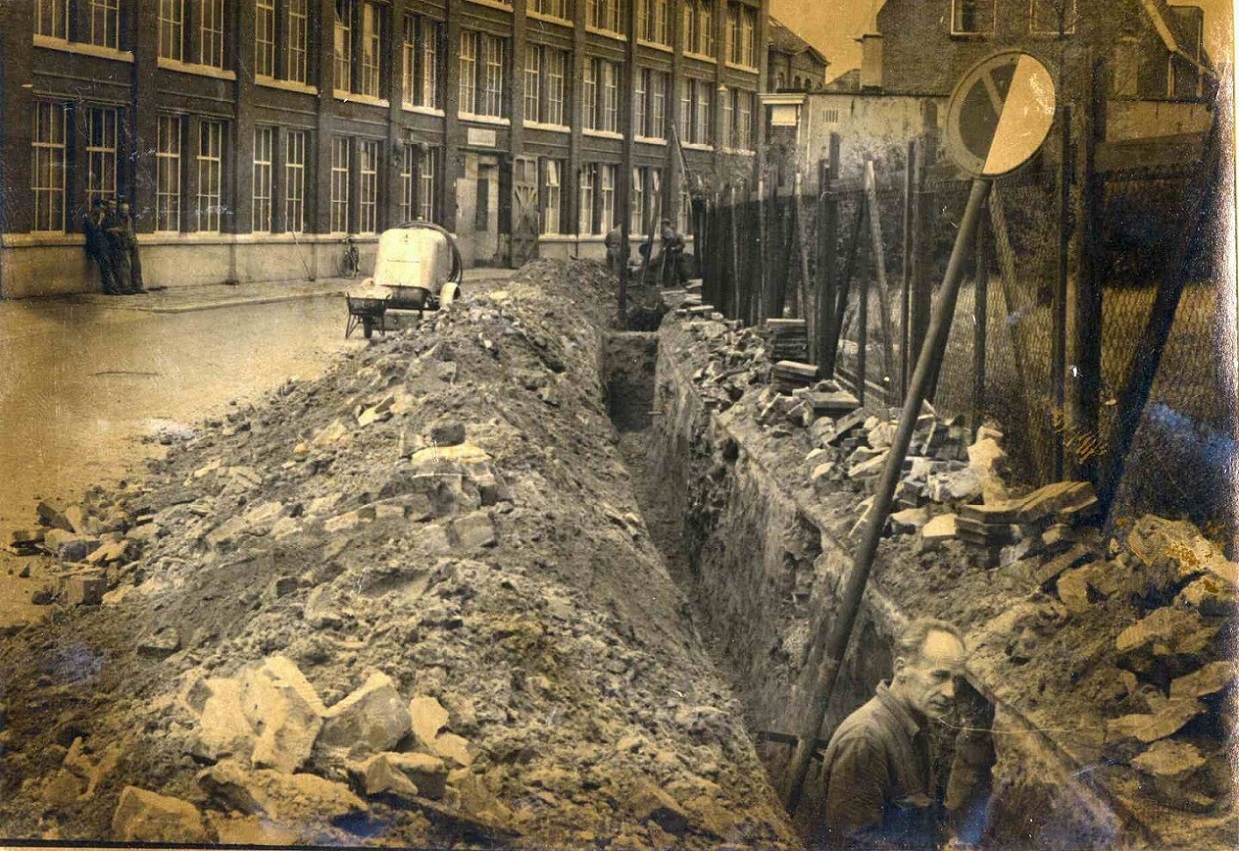 Brinkstraat opengebroken 22-11-1964 Een bouwvakker is bezig met aanleg riolering, elektriciteitskabel o.i.d., ter hoogte van Menko.jpg
