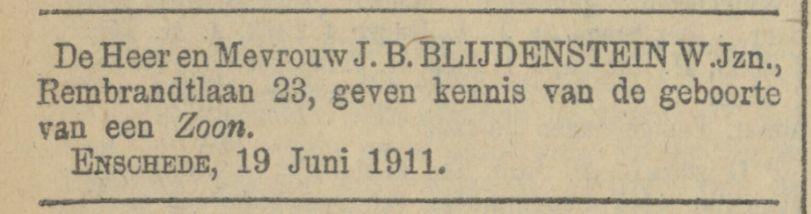 Rembrandtlaan 23 J.B. Blijdenstein W. Jzn. familiebericht 21-6-1911.jpg