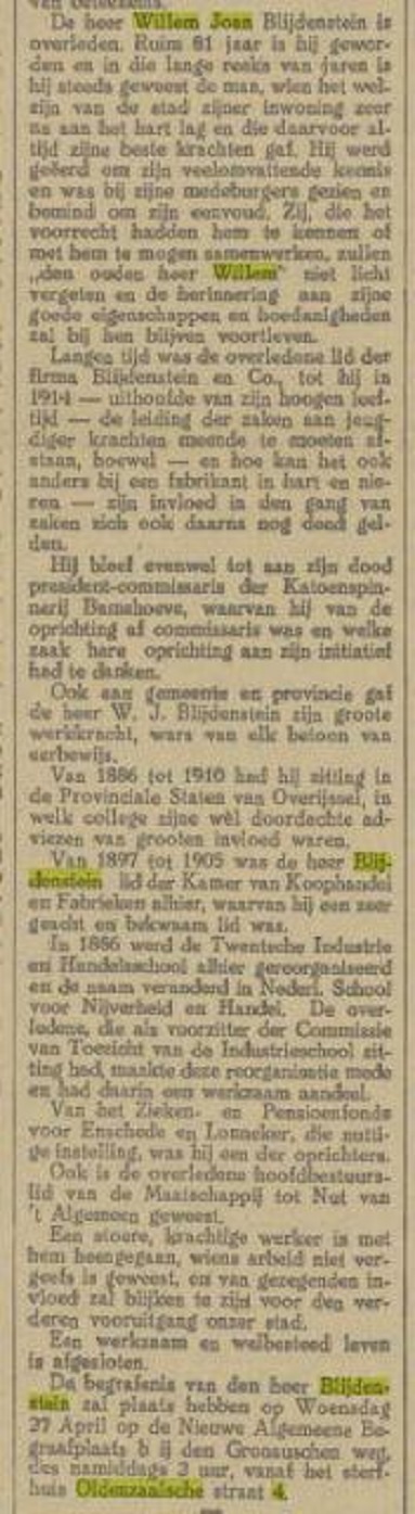 Oldenzaalsestraat 4 W.J. Blijdenstein overleden krantenbericht Tubntia 25-4-1921.jpg
