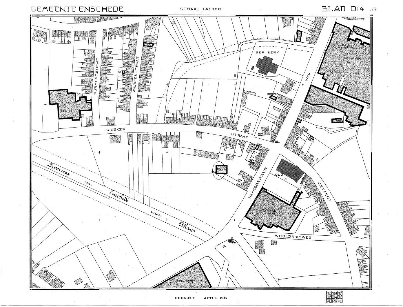 Ook op onderstaande kadastrale kaart van 1913 is de houtzagerij (omcirkeld) te zien in de omgeving Haaksbergerweg en Bleekerstraat.