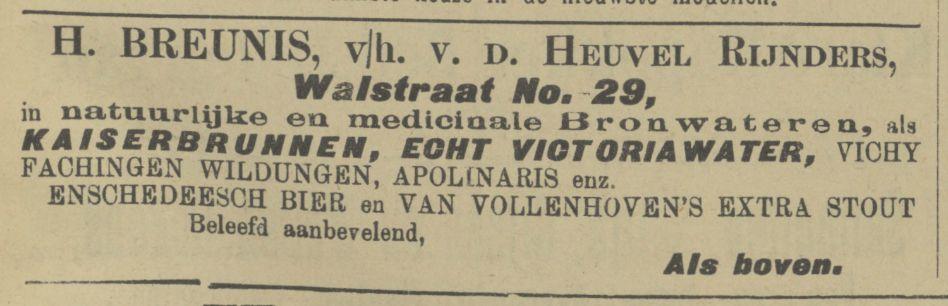 Breunis, H., voorheen v.d. Heuvel Reinders, Natuurlijke Bronwateren,Bier, enz., Walstraat 29.