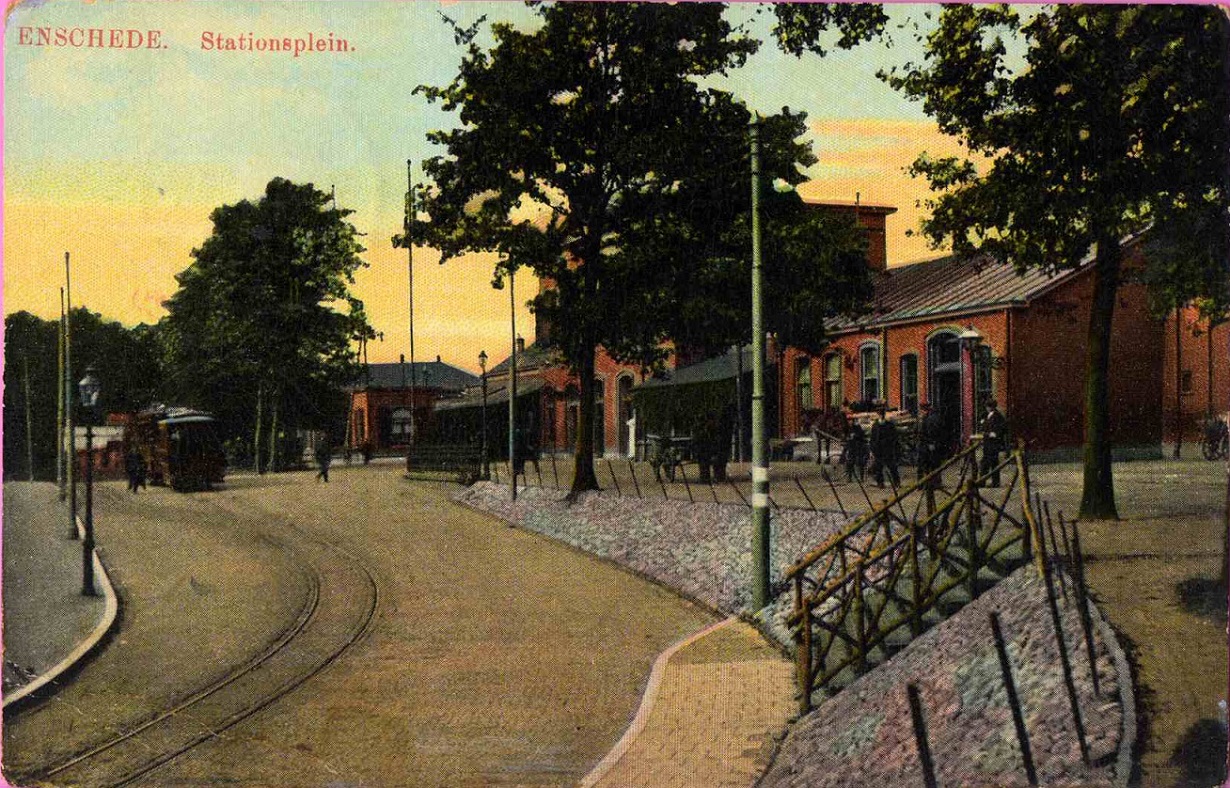 Parkweg 1908 Tram van de Twentse Electrische Tramwegmaatschappij T.E.T. en station Staatsspoor.jpg