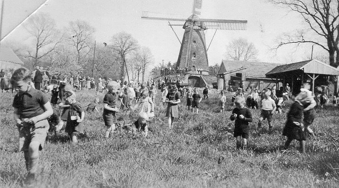 Het Paaseieren zoeken is ook een traditie dat minder gevaarlijk is en gelukkig nog niet is afgeschaft. Hierbij een foto van het Paaseieren zoeken bij de Lonneker molen in 1949.