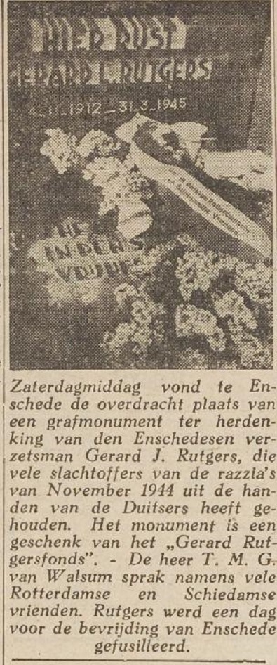 Grafmonument verzetsman Gerard L. Rutgers krantenfoto Vrije Volk 1-4-1946.
