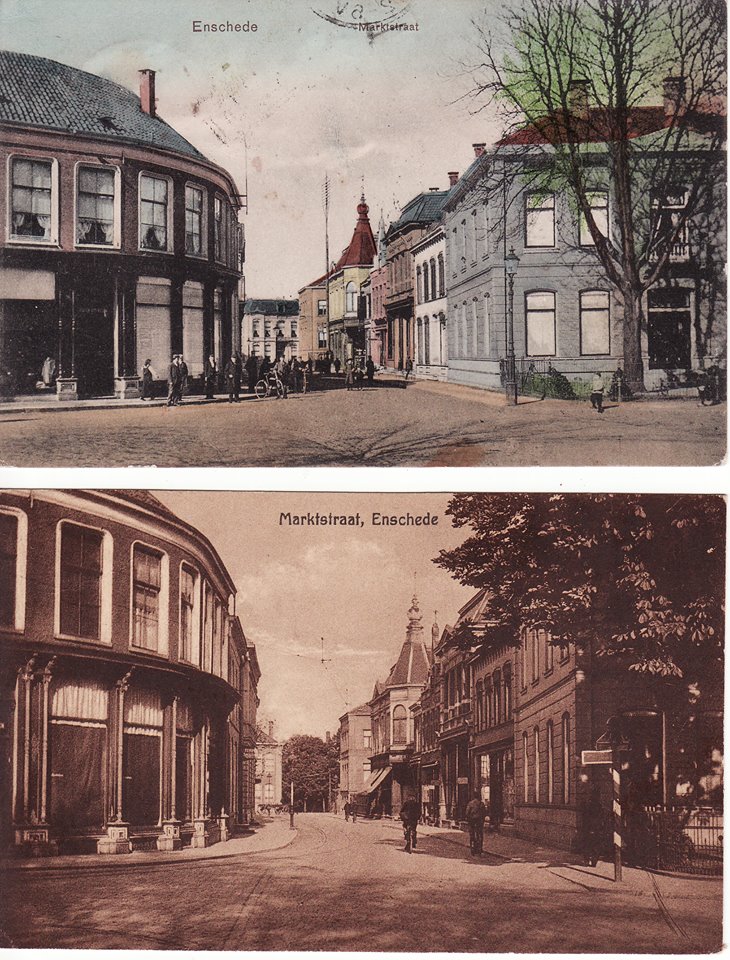 Marktstraat genomen vanaf het zelfde standpunt.Op de bovenste is nog het woonhuis van Helmich van Heek te zien dat begin 1900 werd afgebroken voor de aanleg van de Brammelerstraat