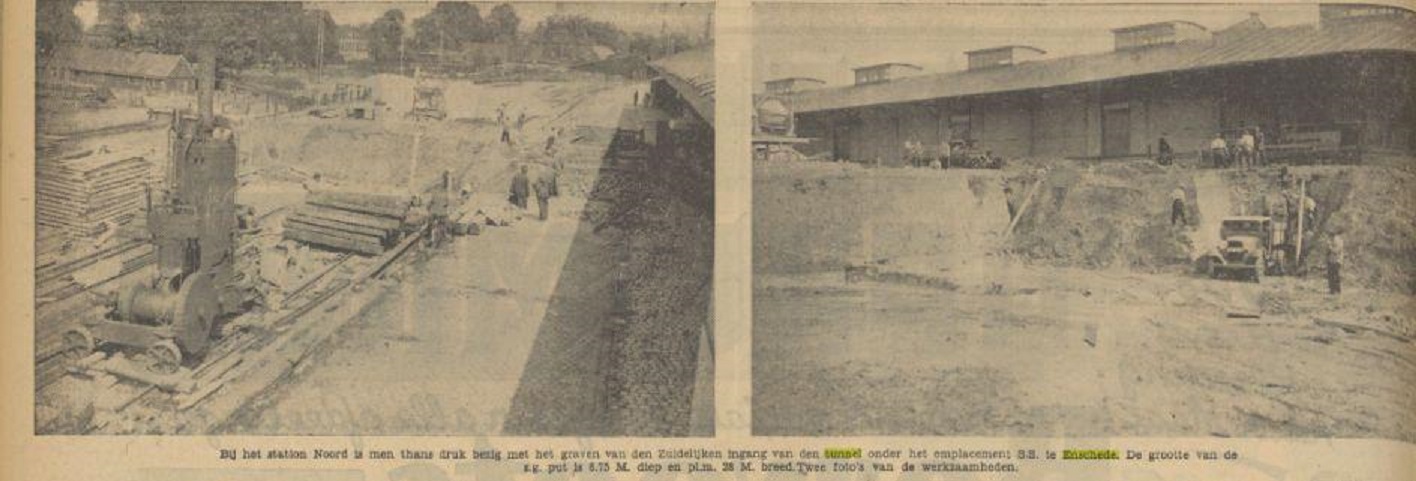 Station Noord tunnel bouw onder emplacement. krantenfoto Tubantia 14-7-1936
