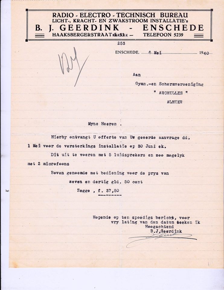 Haaksbergerstraat 253 (vroeger L 53) Radio-, Electro-, Technisch Bureau B.J. Geerdink briefhoofd 6-5-1940.