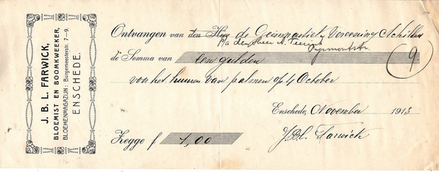 Burgemeesterstraat 7-9 J.B.L Farwick Bloemist em Boomkweker kwitantie nov. 1913
