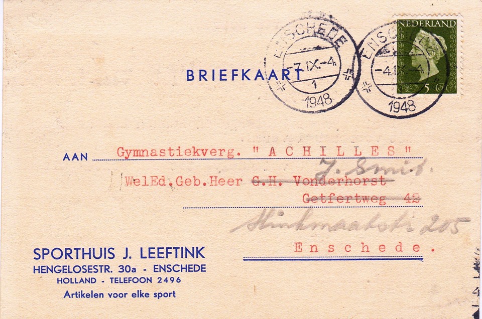 Hengelosestraat 30A Sporthuis J. Leeftink briefkaart sept. 1948.