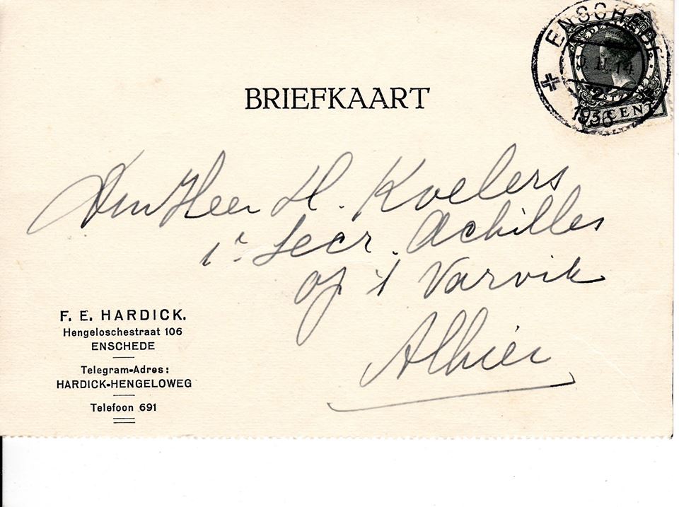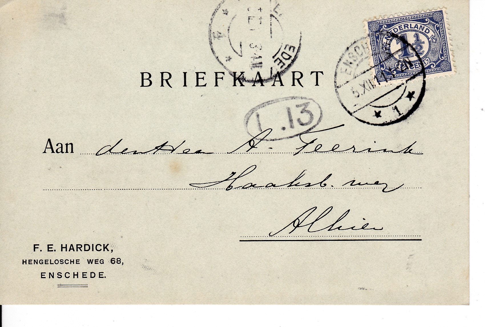 Briefkaarten van F.E. Hardick aan de Hengeloscheweg 68 en Hengeloschestraat 106,