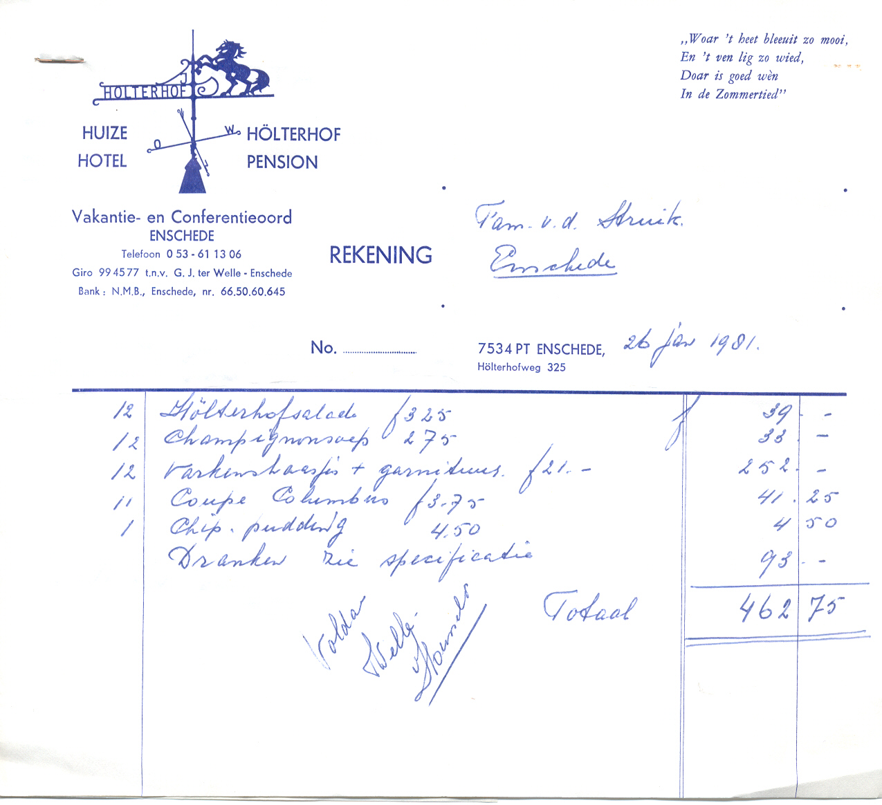 Ongeveer 18 jaar later vierden mijn ouders hun 30-jarig huwelijk bij de Holterhof. Volgens mij staat de handtekening van mevrouw ter Welle op de rekening.