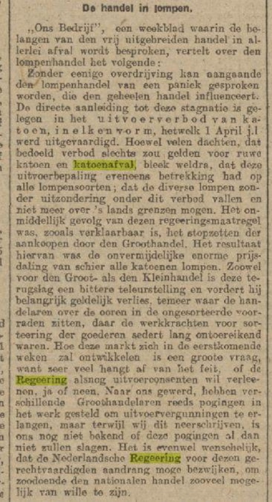 De lompenhandelaren zaten tot over de oren in de ongesorteerde voorraden i.v.m. uitvoerverbod van katoen. Het onmiddellijk gevolg van deze regeringsmaatregel was het stopzetten der aankopen door de Groothandel.