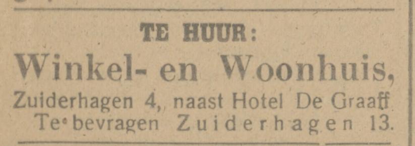 Op 14-4-1916 staat de winkel Zuiderhagen 4 te huur.