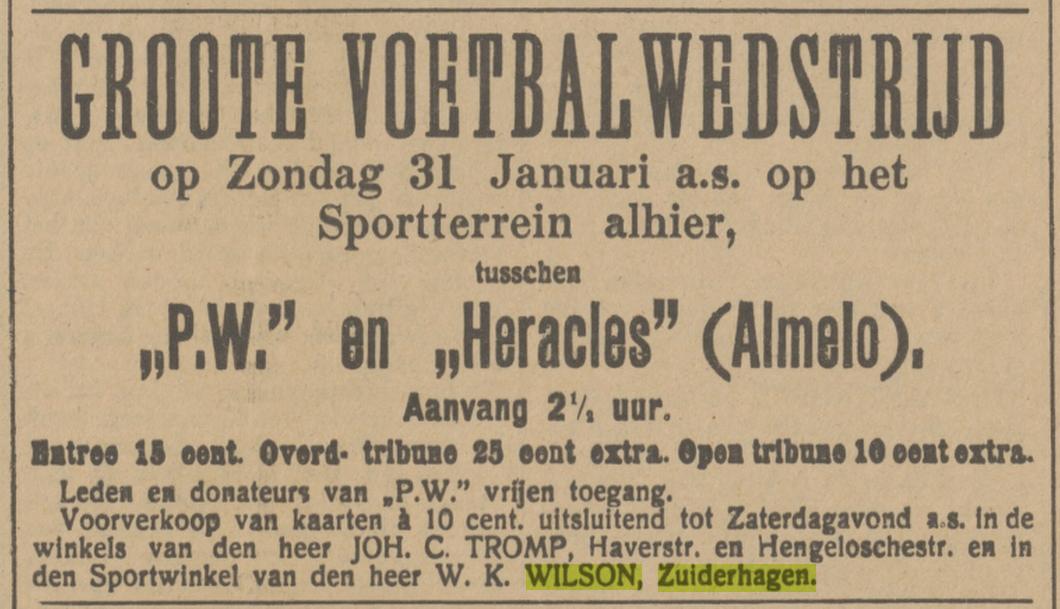 Zoals hierboven verneld kon op 28-1-1915 nog voetbalkaartjes voor de wedstrijd PW-Heracles worden gekocht in de sportwinkel van W.K. Wilson aan de Zuiderhagen.