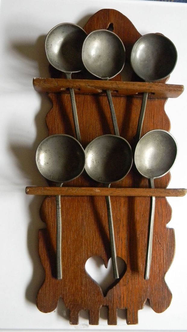 De 2e foto is een rekje met antieke tinnen paplepels.