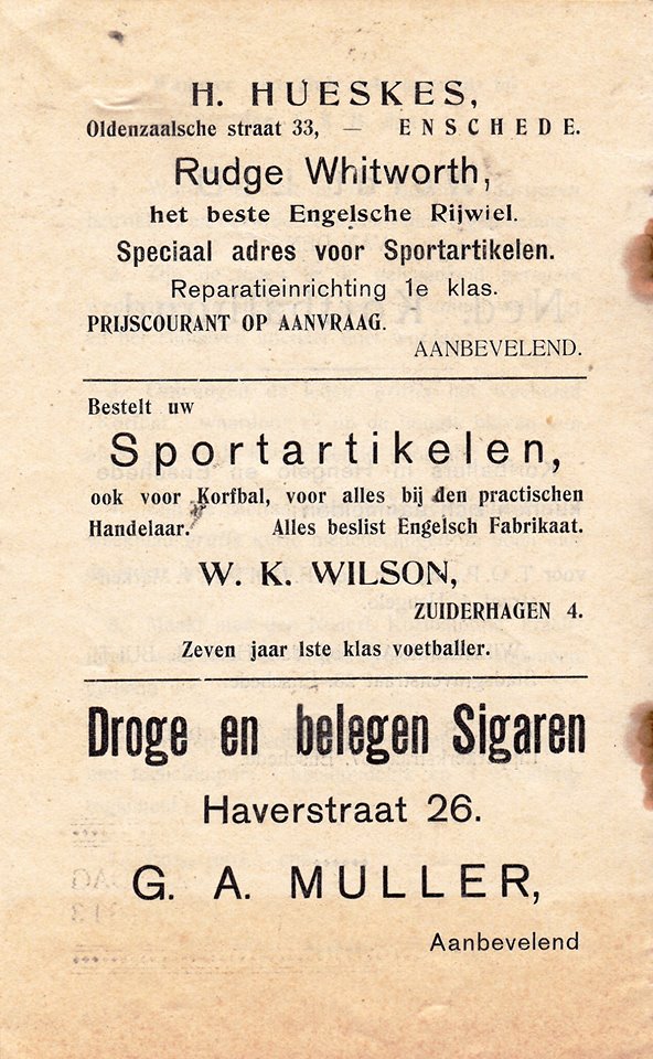 In 1915 wordt in de sportwinkel van W.K. Wilson nog kaartjes verkocht voor de voetbalwedstrijd P.W.-Heracles.
