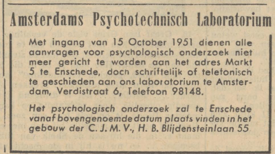 Amsterdams Psychotechnisch Laboratorium Beroepsk.adv., Markt 5.
