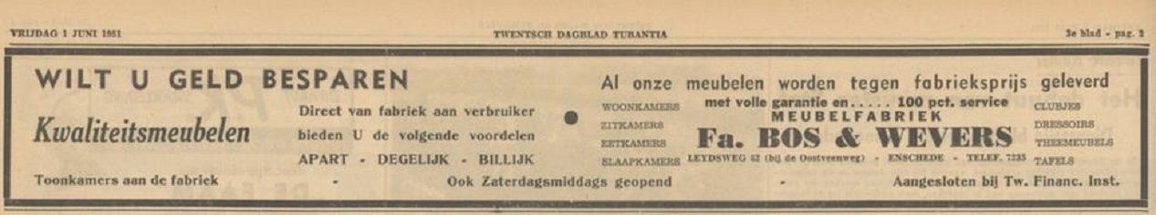 Leijdsweg 62 Meubelfabriek Bos en Wevers advertentie Tubantia 1-6-1951 en 17-3-1950