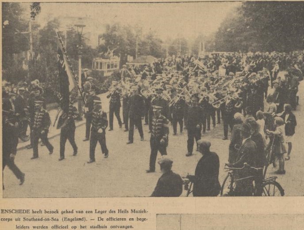 Onderstaande krantenfoto komt ui de Tubantia van 12-9-1932 waarop een muziekcorps van het Leger des Heils uit Engeland is te zien, De officiele ontvangst hiervan was op het stadhuis, maar ik vraag mij af waar deze foto is gemaakt.