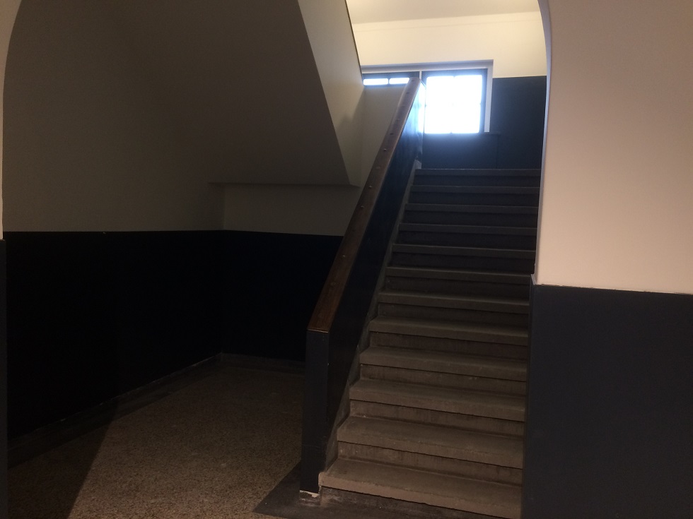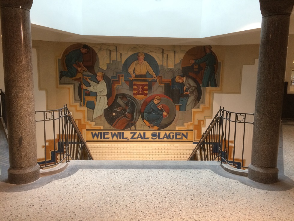 Bij de werkzaamheden aan de ronde bogen in de gangen bleek onverwacht dat de beuken (de overspanning tussen plafond en muren) waren ‘ingepakt’. Die zijn teruggebracht in de originele vorm. De imposante entree met zijn muurschilderingen met ambachtslieden en ronde stenen trappen met ijzeren trapleuningen blijft ook in de originele staat.