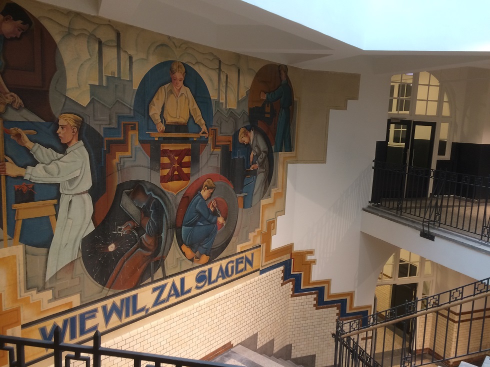 De oude halfronde tegels in één van de gangen zijn bewaard gebleven. Evenals het glas in lood en de houten lambrisering in de vroegere directeurskamer, waaruit het bureau en een vergadertafel gered zijn. „Daar zoeken we een geschikte plek voor, want die moeten natuurlijk hier blijven”, aldus Harthoorn.