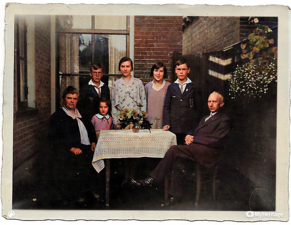 Op deze foto is rechts nog net de Ribbeltsweg nr 26 te zien. Het huis waar mijn grootouders van moederskant woonden en het geboortehuis van mijn moeder. Hier de familie in de jaren 20. Deze foto heb ik ingekleurd via My Heritage, dat kan in coronatijd onbeperkt. Soms zoals hier met verrassende resultaten.