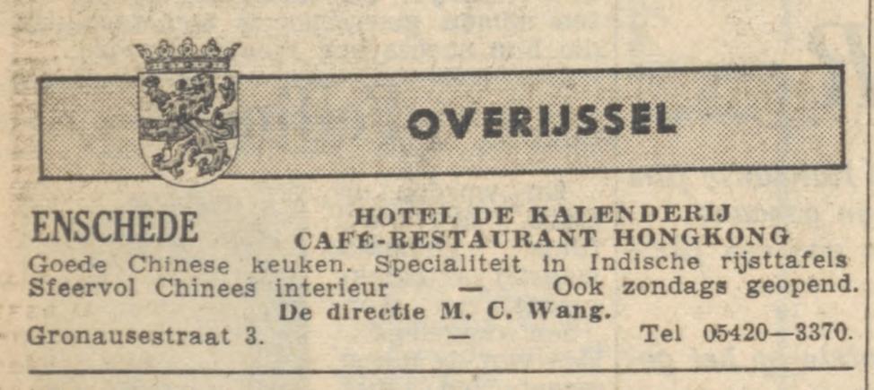 Gronausestraat 3 cafe restaurant Hongkong advertentie Parool 6-8-1950