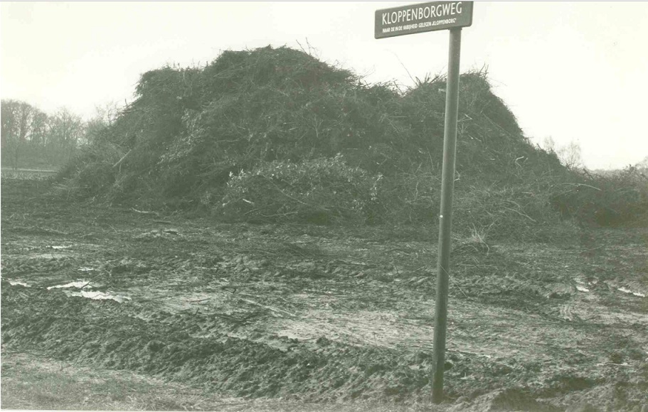 Kloppenborgweg straatnaambord Kruising Helweg, paasvuur in aanbouw 1-4-1983.jpg