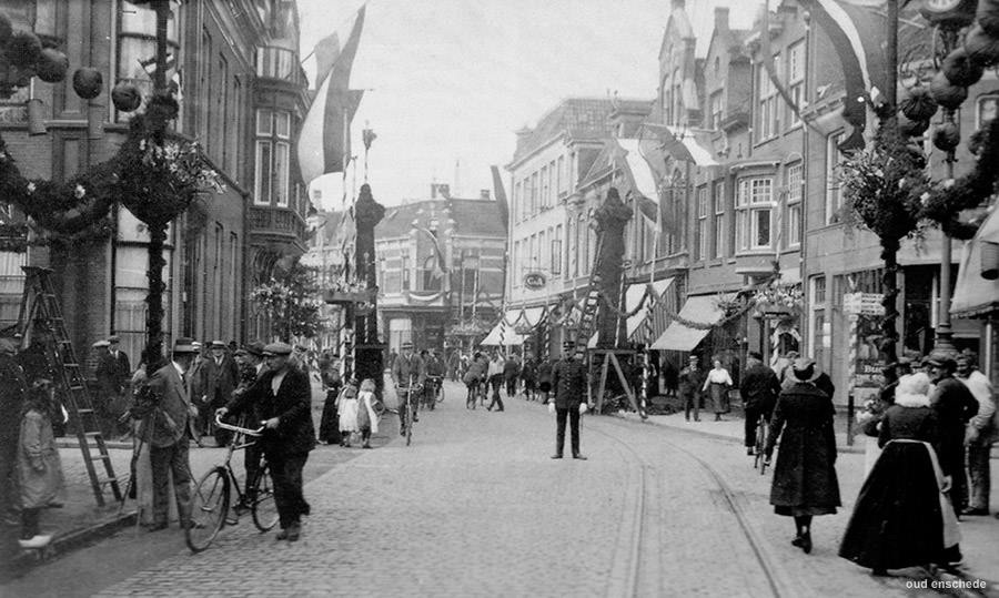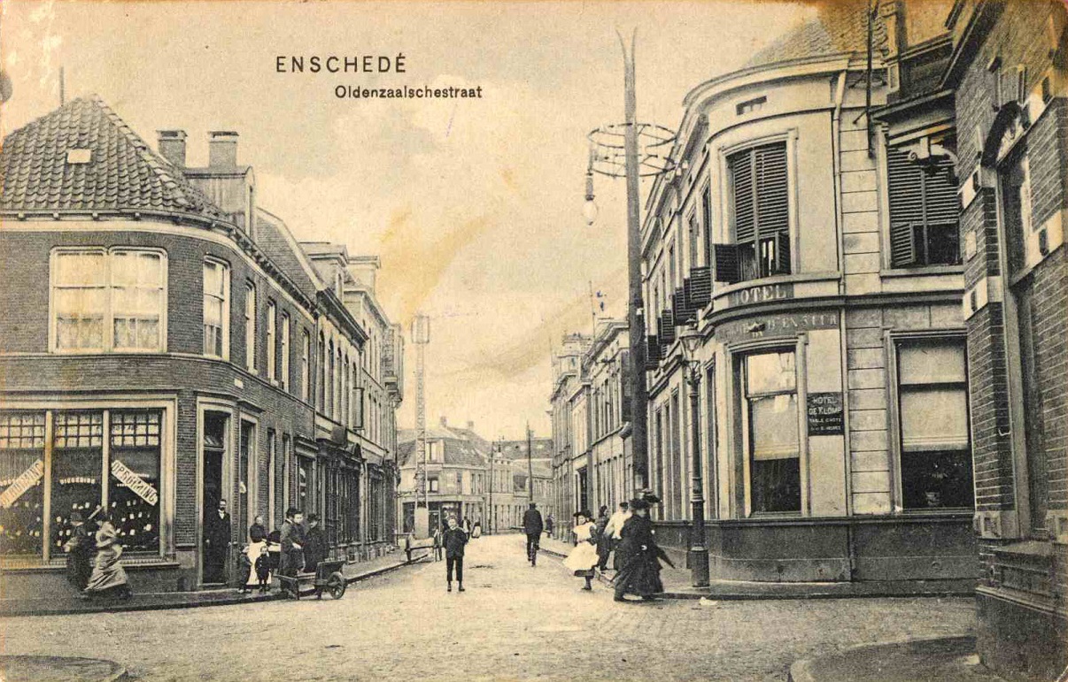 Zoals op vorige foto's al was te zien stond op de hoek Gronausestraat en Kalanderstraat het cafe Centraal (ook wel cafe De Top genoemd) met het mooie torengeveltje. Dit pand is helaas bij het bombardement van 22-2-1944 verloren geraakt. Op die plek kwam dus later het pand van de Hema.