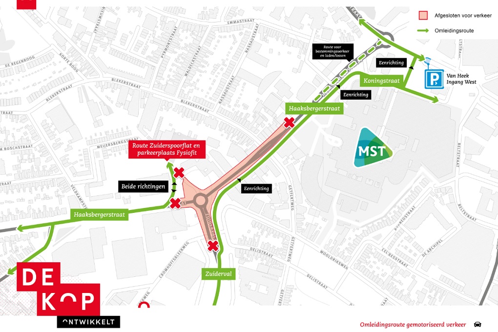 De busbaan is tijdens de werkzaamheden een éénrichtingsweg voor verkeer richting het centrum van Enschede. De inrit van het MST aan de Haaksbergerstraat is ook alleen via de Zuiderval te bereiken. Alle inritten van de Van Heekgarage blijven tijdens de werkzaamheden bereikbaar. De planning is dat de kruising Zuiderval-Haaksbergerstraat in maart 2021 weer opengaat. Nog even geduld dus.