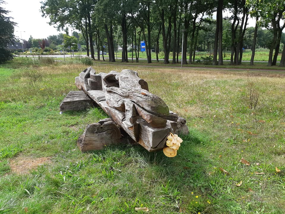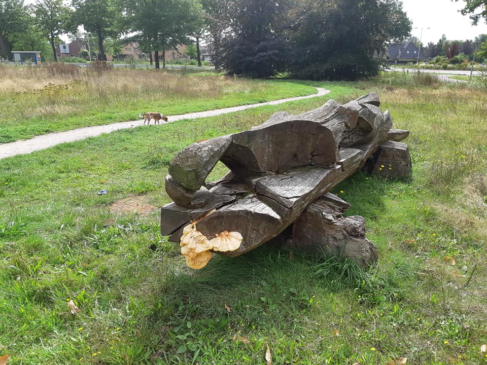 De R is weer in de maand en de herfst zal dus weer komen. Vele eikels vallen van de bomen en de paddestoelen komen uit de grond. Vanmiddag bij mijn wandeling met hondje Simba zag ik ook deze mooie zwam aan het boomstammenbankje in het parkje van Bomenmuseum West aan de Ferdinand Bolstraat hoek Haaksbergerstraat.