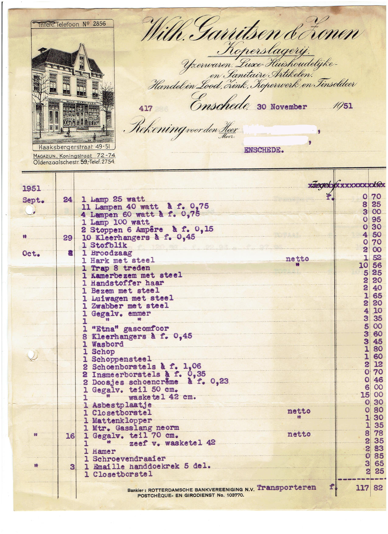Haaksbergerstraat 49-51 Wilh. Garritsen & Zonen Koperslagerij rekening 30-11-1951. bron: facebook
