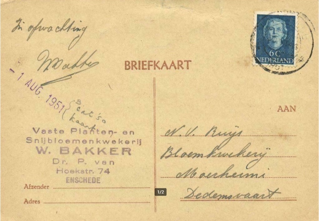 Dr. P. van Hoekstraat 74 W. Bakker Vaste Planten- en snijbloemenkwekerij. briefkaart