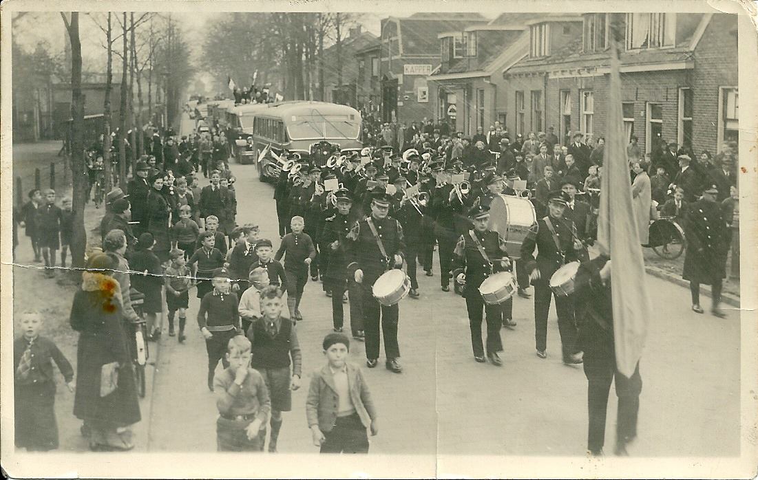 Richtersweg 20-30 muziekcorps met bussen ivm kampioen Rigtersbleek. nr. 28 hoek Penninkstraat winkel groente en fruithandel J. Kanon.jpg