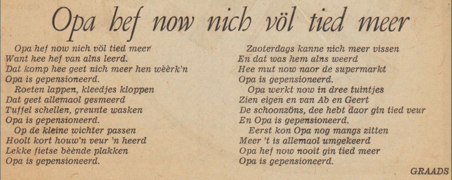 Gel mos ineens heel hard lachen: wat zint jullie allemoal toch ernstig. Ik brenge vrolijkheid en waarmte in de weareld. De zunne is gel, de moane is gel, de sterren zint gel. Iederene den naar 'n zunnebloome kik, wödt vrolijk en bliej.