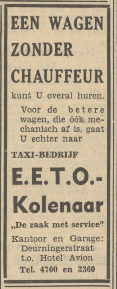 Dat is geen 8 cijferige telefoonnummer, maar 4700 en 2360 zijn 2 aparte telefoonnummers waaronder E.E.T.O. taxi onderneneming Kolenaar was te bereiken. Zie onderstaande advertenties van 1948 en 1950.