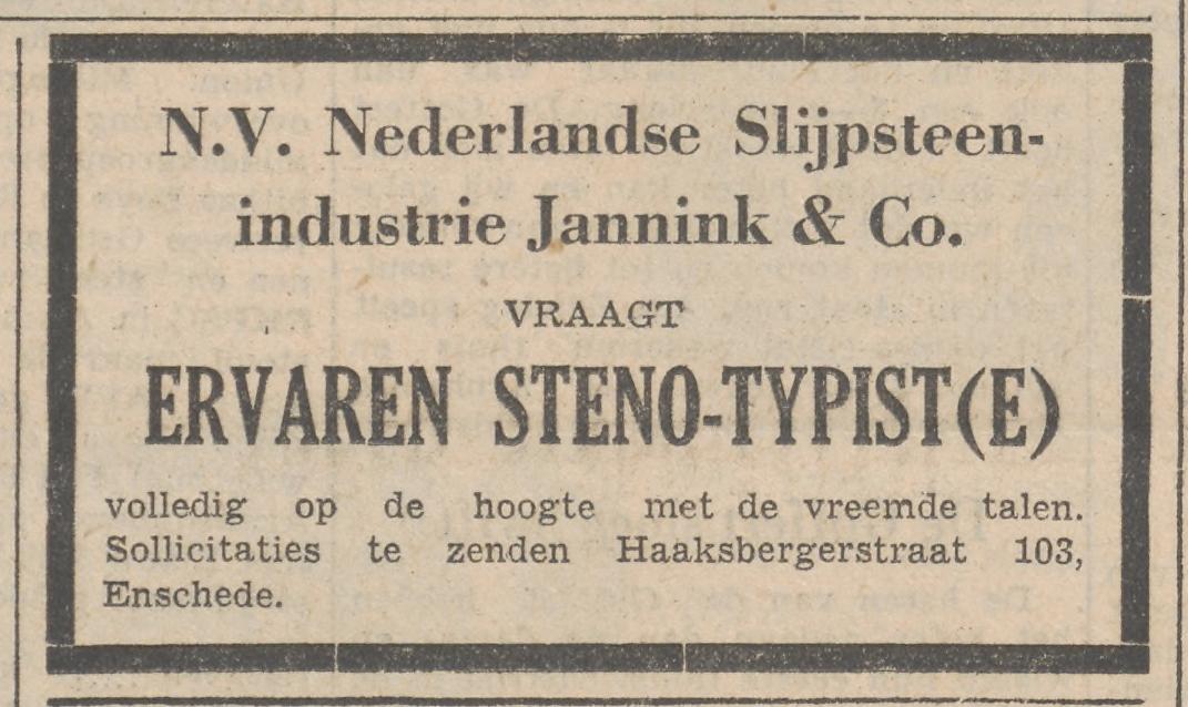 - Haaksbergerstrat 103 N.V. Nederlandse Slijpsteenindustrie Jannink & Co. advertentie Tubantia 15-2-1950.jpg (58.74 KiB) 2656 keer bekeken