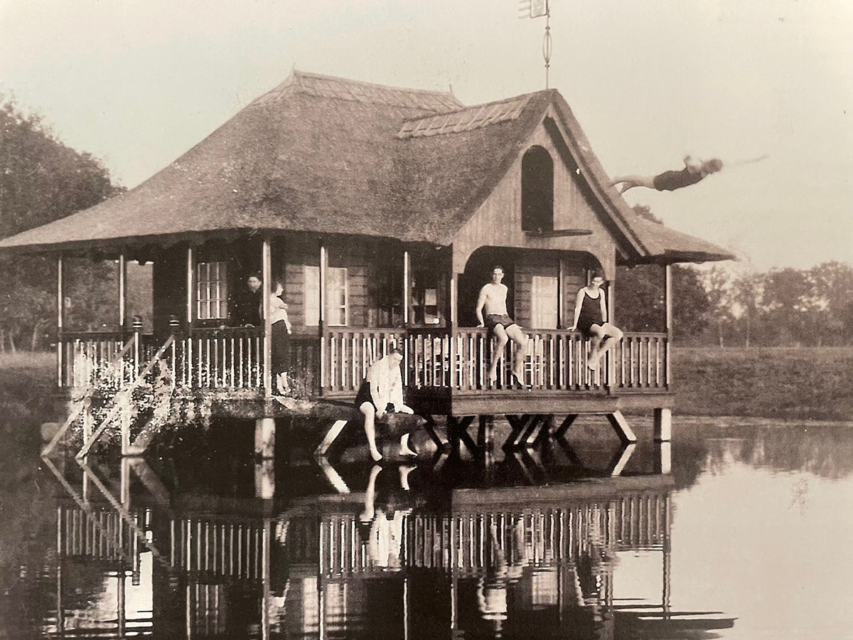Op de oude foto uit ong. 1930 neemt Nico Scholten een duik van het dak (uit boek 'Heren op het land')