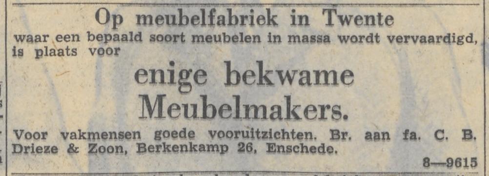 Berkenkamp 26 meubelfabriek Fa. C.B. Drieze & Zoon advertentie De Volkskrant 22-10-1949.jpg